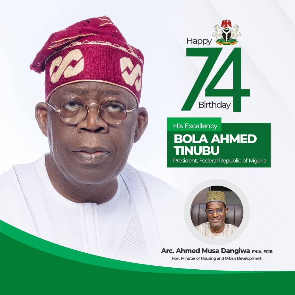 The Honourable Minister of Housing and Urban Development, Arc. Ahmed Musa Dangiwa has celebrated President Bola Ahmed Tinubu GCFR on his 74 birthday. This was contained in a statement signed by the Honourable Minister himself.