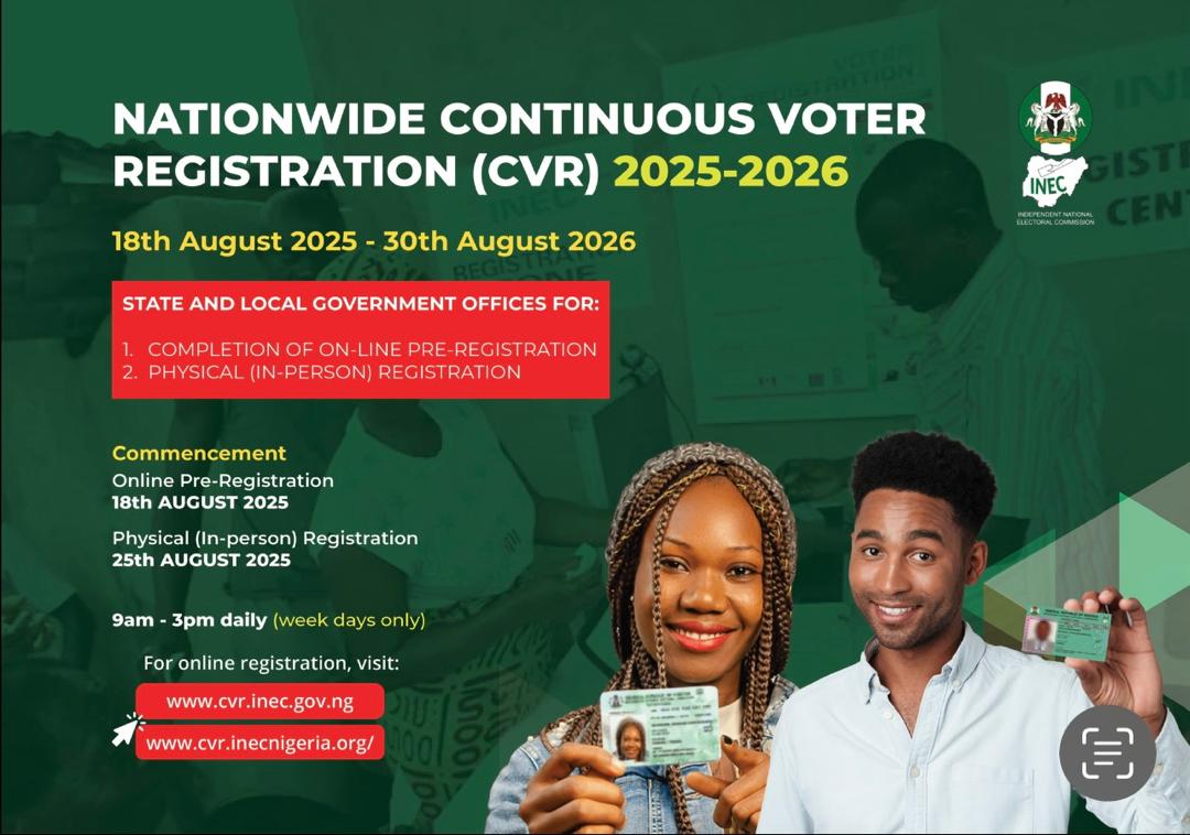 INEC disclosed that online pre-registration will begin on August 18, while in-person registration will commence on August 25, 2025.