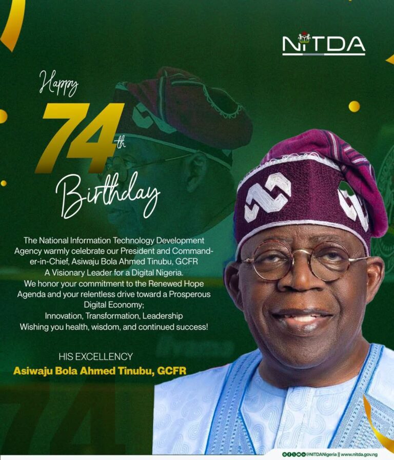 The National Information Technology Development Agency (NITDA) has extended warm birthday congratulations to President Bola Ahmed Tinubu on the occasion of his 74th anniversary, describing him as a visionary leader driving Nigeria’s digital transformation.